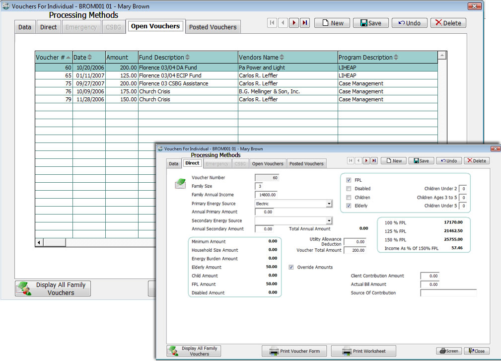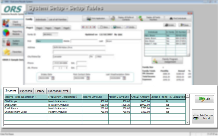 ORS allows for the tracking of income and expenses to help calculate FPL% and much more. Using the "Quick Tabs" simply select the data you want to view and all the information is at your finger tips.